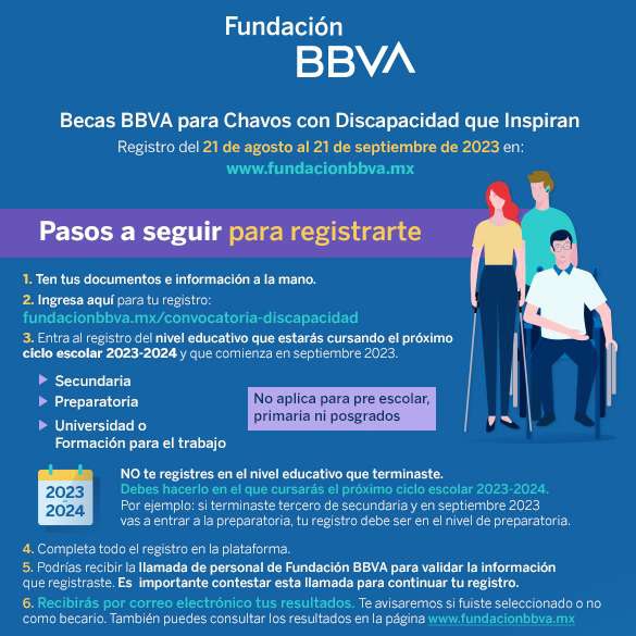 BBVA Bancomer Ir a la ofertaLa convocatoria para las becas BBVA para estudiantes con discapacidad inició desde el día 21 de agosto y estará disponible hasta el 21 de septiembre. Esta beca incluye un apoyo económico y acompañamiento integral para las becarias y becarios, y sus familias.
