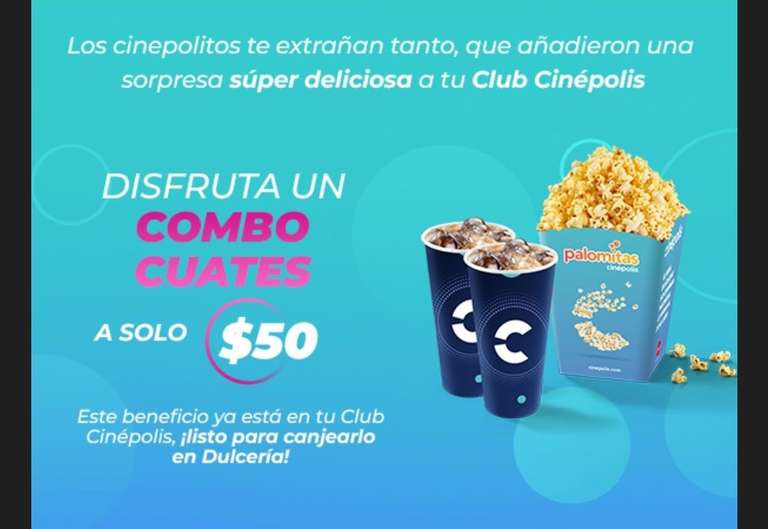 El combo incluye dos refrescos tamaño jumbo (1.2 L) de cualquier sabor y una canasta de palomitas sabor mantequilla tamaño jumbo (215 g). Las cantidades son aproximadas. El cambio de sabor en palomitas se cobra por separado. Promoción válida de lunes a domingo. Válido únicamente en punto de venta en cine. Válido en todos los Cinépolis® de la República Mexicana. No aplica en Cinépolis VIP®. Vigencia al 27 de septiembre de 2023. Producto sujeto a disponibilidad. El precio es en moneda nacional e incluye IVA. No participa con otras promociones o descuentos.