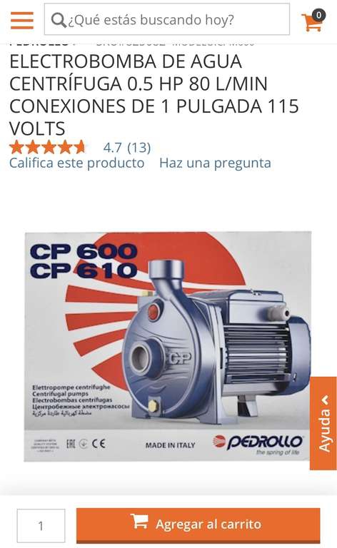 Home Depot Ir a la ofertaELECTROBOMBA DE AGUA CENTRÍFUGA 0.5 HP 80 L/MIN CONEXIONES DE 1 PULGADA 115 VOLTS