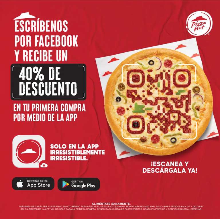 Pizza Hut 40% de descuento en la primera compra escribiéndoles en Facebook