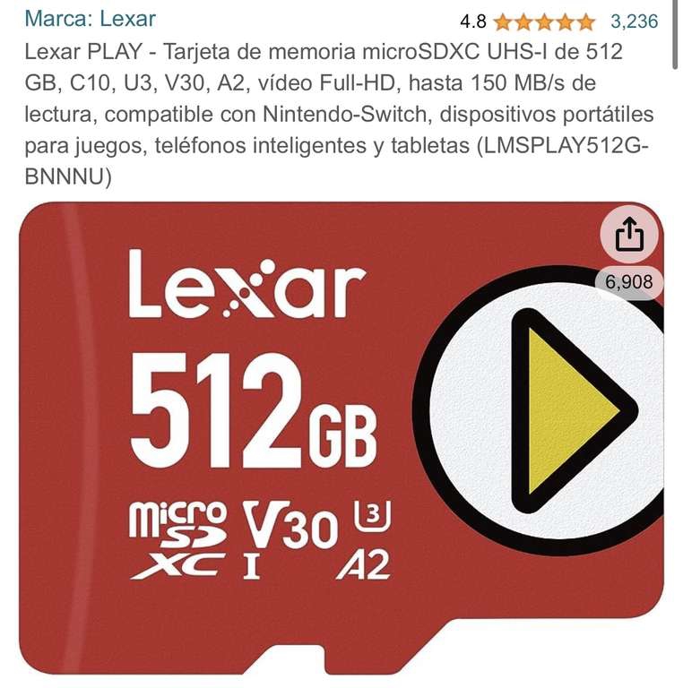 Amazon Ir a la ofertaLexar PLAY - Tarjeta de memoria microSDXC UHS-I de 512 GB, C10, U3, V30, A2, vídeo Full-HD, hasta 150 MB/s de lectura, compatible con Nintendo-Switch, dispositivos portátiles para juegos, teléfonos inteligentes y tabletas (LMSPLAY512G-BNNNU)