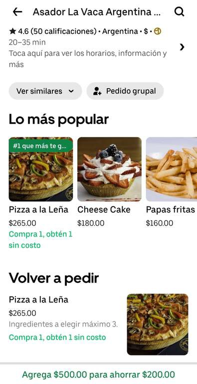 Uber EatsEn Uber eats en asado la vaca argentina está la promoción de dos pizzas por 265 y adicional a eso tienen la promoción de compra 500 y te descuentan documentos. Entonces haciendo esa combinación las dos pizzas te salen en 65. La promoción es en Irapuato Guanajuato.