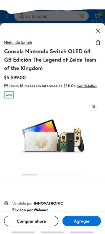 Walmart Ir a la ofertaNINTENDO SWITCH OLED EDICIÓN ZELDA 5049MXN utilizando cupon en walmart y haciendo Pick Up en tienda. WMTEDA550