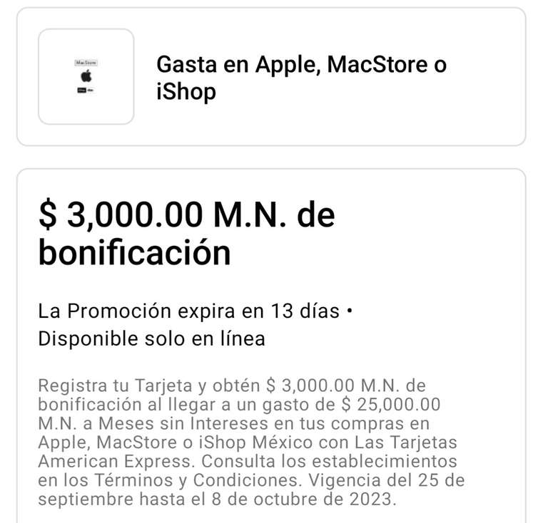 Al registrar y guardar la oferta en su Tarjeta, usted acepta los Términos de la oferta. Oferta válida para compras realizadas en tiendas físicas en México, en línea, o en aplicación móvil con Apple México (www.apple.com/mx), MacStore México (www.macstoreonline.com.mx) o iShop México (www.ishopmixup.com) y que hayan sido facturadas por dentro de la vigencia de la promoción o la compra no será elegible para recibir la bonificación. En el caso de una compra realizada durante el período de la oferta, es posible que no califique si el comerciante carga la Tarjeta registrada en una fecha diferente (por ejemplo, en la fecha de envío o entrega) y esa fecha ocurre después de que finaliza la oferta. Si American Express no recibe información que identifique su compra como elegible para la oferta, no recibirá el crédito de estado de cuenta.