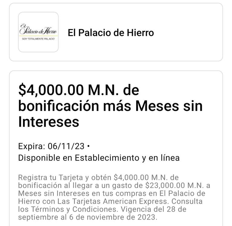 Al registrar y guardar la oferta en su Tarjeta, usted acepta los Términos de la Oferta. Oferta válida para compras realizadas en tiendas físicas o en línea con El Palacio de Hierro (www.elpalaciodehierro.com/) y Casa Palacio (www.elpalaciodehierro.com/casapalacio/) que hayan sido facturadas dentro de la vigencia de la promoción o la compra no será elegible para la bonificación. Es posible que una compra no califique si el comerciante carga la Tarjeta registrada en una fecha diferente y esa fecha ocurre después de que finaliza la oferta. Si American Express no recibe información que identifique su compra como elegible para la oferta, no recibirá el crédito en el Estado de Cuenta.