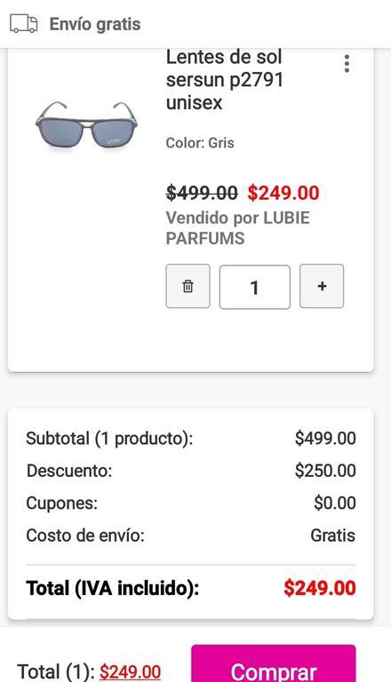 Liverpool Ir a la ofertaHe comprado estas gafas antes, cuando las compré y agregué al carrito me apareció un precio menor y los compré a ese precio, tienen más del 50% regularmente tienen descuento pero de $399 están en $249