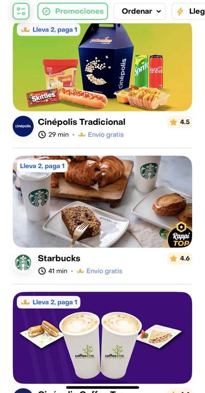 RappiHay varias cosas en 2x1 en Coffee Tree, Cinepolis y Starbucks.