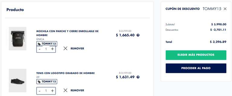 Tommy Hilfiger Ir a la ofertaEncontré muy buenos descuentos, hasta el 40% + 15% con el CUPON de TOMMY15 con una compra mínima de $2,499.00