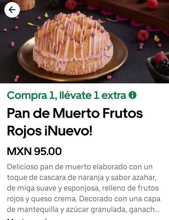 Uber Eats, El Globo: 4 panes de muerto frutos rojos por $40 | Miembros One, 2x1 + cupón de ahorro de $150 comprando $350.