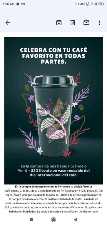 Café Sirena, S. de R.L. de C.V. en Av. Revolución #1267 piso 21, Col. Alpes, Álvaro Obregón, CDMX, C.P. 01040, te ofrece: en la compra de una bebida caliente, helada o Frappuccino tamaño Grande (400 mL) o Venti (500 Ml) preparada en barra +$20 pesos llévate un vaso reusable del día internacional del café. Vigencia del 01 de octubre de 2023 y hasta agotar existencias. Limitado a 118,000 vasos del día internacional del café a nivel nacional. Se dará un vaso reusable por cada bebida participante ordenada + $20 pesos. Las bebidas y modificadores se cobrarán al precio de lista. No participan bebidas embotelladas ni café del día. Aplica varios vasos en el mismo ticket. Promoción sin valor en efectivo. No acumulable con otras promociones, cupones, descuentos ni beneficios del programa Starbucks Rewards. Sujeto a disponibilidad de vasos reusables en tienda. Válido en tiendas Starbucks Coffee en la República Mexicana, Pick Up (recoge en tienda), Car Pickup (recibe en tu auto) y servicio Delivery Starbucks (entrega a domicilio), aplica en servicio a domicilio con agregadores (Didi, Uber, Rappi). Precios en MXN. Todos nuestros precios incluyen IVA ©️ 2023 Starbucks Coffee Company. Todos los derechos reservados. CUIDA EL AGUA.