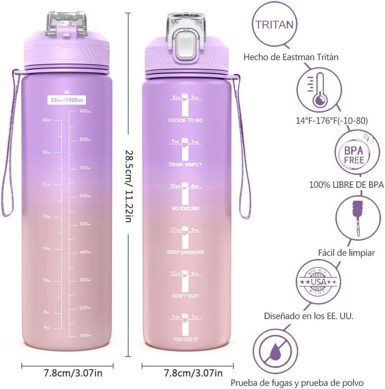 Amazon Ir a la ofertaBotella de agua 1 litro,Botella de agua deportiva, Apertura con un botón, Con pajita y marcador de tiempo. Violeta. Envío gratis con prime