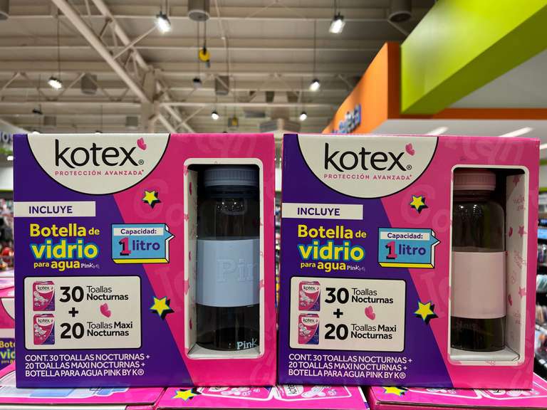 + 1 botella de vidrio de 1 litro Pink by Kotex, color rosa o azul.