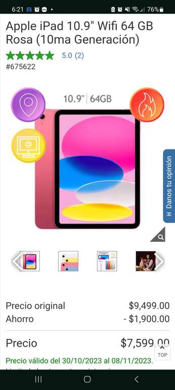 Costco Apple iPad 10.9" Wifi 64 GB Rosa (10.ª generación)