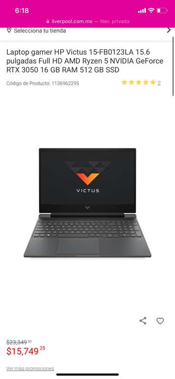 Liverpool Ir a la ofertaLaptop gamer HP Victus 15-FB0123LA 15.6 pulgadas Full HD AMD Ryzen 5 NVIDIA GeForce RTX 3050 16 GB RAM 512 GB SSD