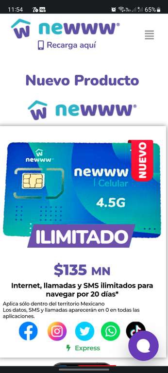 Newww Ir a la ofertaInternet, llamadas y SMS ilimitados para navegar por 20 días*
