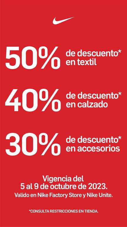 Nike Factory Store: 50% OFF en textil, 40% en calzado y 30% en accesorios | Del 5 al 9 de octubre 2023 | Sólo tienda física