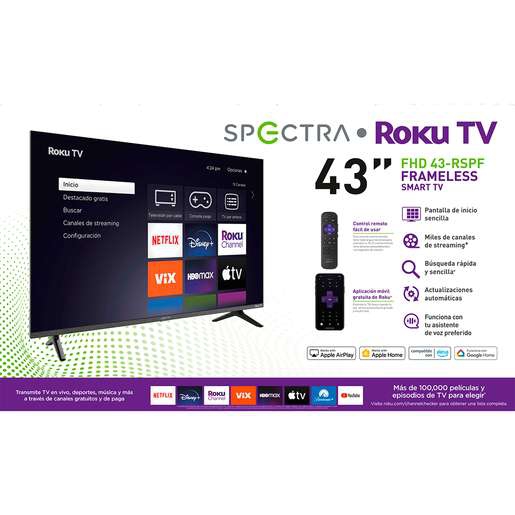 Sumérgete en la experiencia visual definitiva a cargo de la Pantalla Spectra Smart TV Roku 43 pulg. Ofrece una calidad de imagen excepcional que te aportará una amplia gama de posibilidades para impulsar tu entretenimiento.