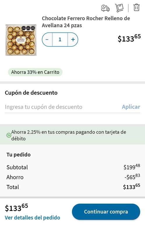 Sam's Club Ir a la ofertaChocolates ferro 24 piezas se me hace buen precio para un regalo para la novia la amantes o ir preparando los chocolates para navidad de la familia... precio original va de los 200 a 230 pesos se me hizo Buena la oferta se llega al precio al agregar al carrito con membresía sams plus envío gratis si compras más de 1000