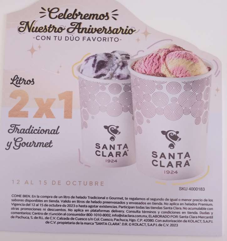 Santa Clara Litros de helado 2x1 del 12 al 15 de octubre