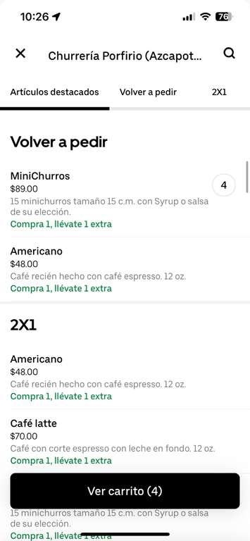 Uber EatsAñade 2 churros al 2x1, (te deben aparecer 4 churros en el carrito) y al momento de pagar, se te hace un descuento de 110 y te quedan en $68 siendo Uber one.(y)