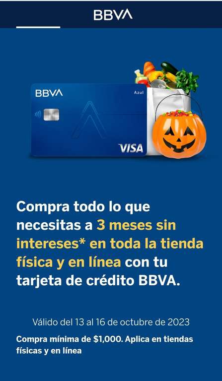 BBVA Bancomer Ir a la oferta3 meses sin intereses en tienda y en línea, a partir de 1000 pesos de compra.
