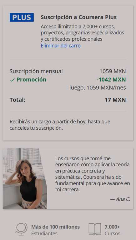 Ir a la oferta>cancelar tus suscripciones existentes para evitar que se te cobre tanto por Coursera Plus como por suscripciones de especialización individuales. Ninguno de los progresos de tu curso se verá afectado si cancelas las suscripciones anteriores.