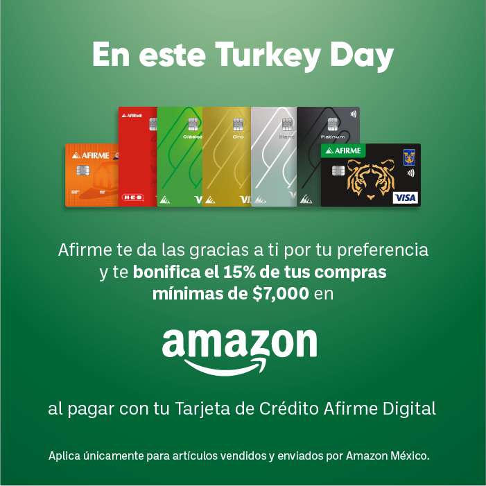 Valido en compras realizadas del 23 al 27 de noviembre de 2023 por un monto mínimo de $7,000 pesos pagando con las tarjetas de crédito: Afirme Clásica, Afirme Tigres, Afirme HEB, Afirme Construrama, Afirme Oro, Afirme Platinum, Afirme Blanc en su versión digital.