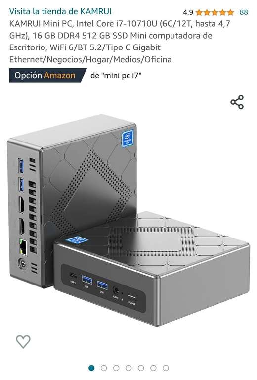 Amazon Ir a la ofertaKAMRUI Mini PC, Intel Core i7-10710U (6C/12T, hasta 4,7 GHz), 16 GB DDR4 512 GB SSD Mini computadora de Escritorio, WiFi 6/BT 5.2/Tipo C Gigabit