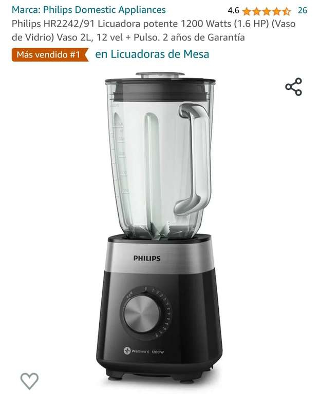 Amazon Ir a la ofertaPhilips HR2242/91 Licuadora potente 1200 Watts (1.6 HP) (Vaso de Vidrio) Vaso 2L, 12 vel + Pulso. 2 años de Garantía