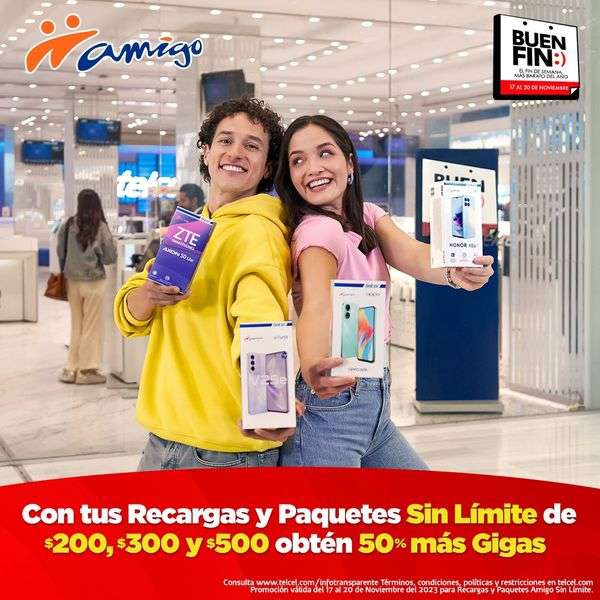 Telcel Ir a la ofertaLa promoción aplica para los paquetes Amigo sin Límite: 200, 300 y 500 de Telcel. Al comprar cualquiera de dichos paquetes ofrecen 50% más de gigas para navegación. Desconozco la vigencia de la oferta