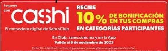 Sam's ClubCashi dará 10% de bonificación en compras en categorías participantes, en Sam's club, en la tienda, en línea y en la app. Sólo el 9 de noviembre.