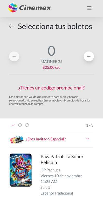 Cinemex Ir a la ofertaLa película de paw Patrol estará a 25 pesos en Cinemex Gran patio Pachuca, creo que igual en plaza del valle solo que ahí empieza el sábado, chequen sus cines cercanos.
