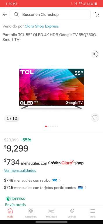 Claro Shop: Pantalla TCL 55" 55Q750G QLED con Android TV y 120Hz