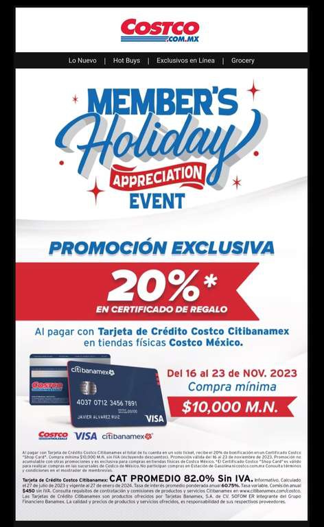 20% en certificado de regalo al usar código y pagar con Tarjeta de crédito Costco Citibanamex en tiendas físicas Costco México.