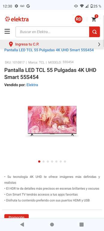 Elektra Ir a la ofertaPantalla LED TCL 55 Pulgadas 4K UHD Smart 55S454