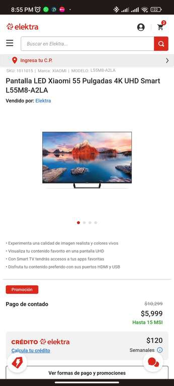Elektra Ir a la ofertaEsta más barata que en la tienda Xiaomi, para los que no alcanzaron la de 65 pulgadas me parece buena oferta y tiene opción de meses