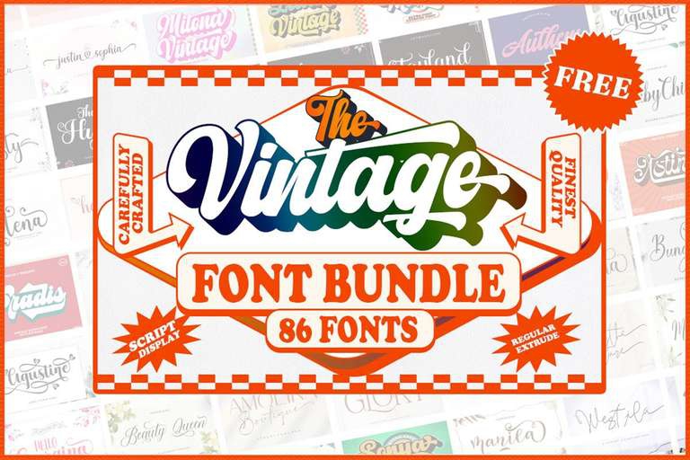 Descubra infinitas posibilidades de diseño con The Vintage Font Bundle, una colección seleccionada de 86 impresionantes fuentes. Aún más sorprendente es que es completamente GRATIS y le ofrece increíbles ahorros de -,107. ¡Descárgalo ahora y añade un toque de encanto atemporal a tus proyectos de manualidades! Licencia Comercial incluida.