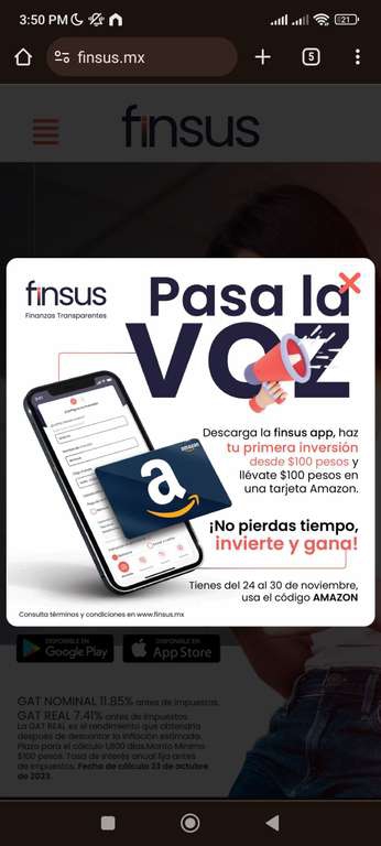 Ir a la ofertaDescarga la app y con 100 pesos que inviertes te regalan una tarjeta de $100 de Amazon