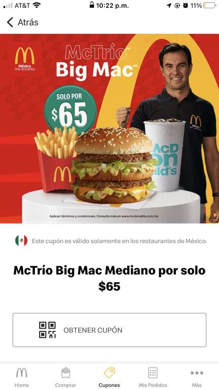 Vigencia del 19 al 21 de Noviembre 2023, a partir de las 12:00 pm, muestra este cupón en tu celular en los restaurantes McDonald´s participantes** y obtén McTrío Big Mac Mediano por solo $65.** No Válido en Puebla,Tlaxcala y Tehuacan.