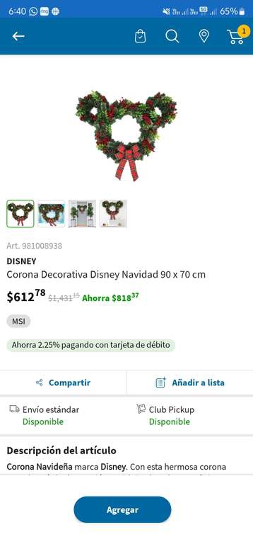 Sam's Club Ir a la ofertaCorona navideña de sams Mickey Mouse está en 600 pesos. Aún no actualizan los precios en los clubs por lo que veo, pero en scan and go o ya en caja se refleja el costo.