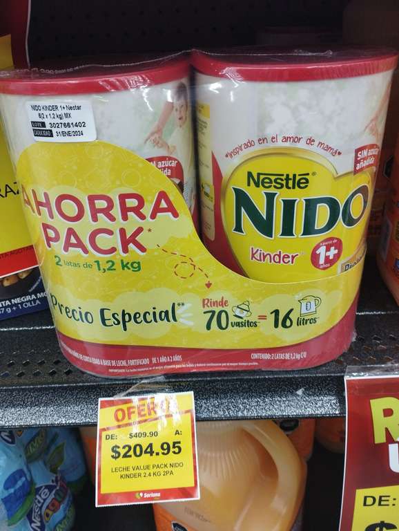 SorianaEncontré estas leches NIDO KINDER en descuento en el soriana de Miramontes, es un paquete de 2 latas de 1.2 Kg c/u en total 2.4kg . Por si a alguien le sirve
