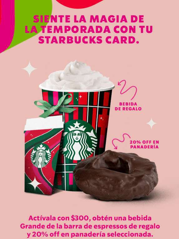 Vigencia de la promoción del 06 al 19 de noviembre de 2023. Activa la Card Red Cup Diecut con $300 o más, regístrala en el programa Starbucks Rewards, y obtén una bebida tamaño Grande (400ml) participante* de cortesía + 20% de descuento en una pieza de panadería participante**. Al ordenar en Tienda, Pickup (para llevar), y Car Pickup (recoge en tu auto). Vigencia de un mes a partir de haber realizado la activación de la Card Red Cup Diecut. El beneficio se otorgará siempre y cuando la activación de la Card Red Cup Diecut se realice dentro de la vigencia de la promoción. La Card Red Cup Diecut deberá activarse mediante la aplicación de Starbucks México o en la página starbucks.com.mx. El cupón puede tardar hasta 24 hrs en verse reflejado en tu cuenta. *Bebidas participantes: son las preparadas en la Barra de Espresso (calientes y heladas): Latte, Chai Latte, Cappuccino, Espresso americano, Caramel Macchiato, Flat White, Café Mocha, Café Mocha Blanco, Chocolate Mexicano, Chocolate Blanco, Chocolate caliente, Chocolate Helado. No aplican Bebidas de Temporada (calientes, heladas ni frappuccinos) Refreshers® & Shakens, Teavana®, Cold Brew ni café del día. Las bebidas no incluyen modificadores, éstos se cobrarán a precio de lista. Promoción válida solo en bebidas y tamaño participante. **Panadería participante: Bagel tradicional, Pan de chocolate, Pan de queso, Dona doble chocolate, Croissant mantequilla, Mini cronuts, Cronut de chocolate, Panqué de Linaza, Panqué de limón. En tiendas con pan recién horneado podrás elegir: Pan de chocolate, Croissant multigrano, Croissant mantequilla, Cheesecake roulet, Mini hojaldre de fresa, Mini hojaldre de manzana, Mini hojaldre de naranja. En tiendas Reserve Bar podrás elegir: Pan de chocolate, Croissant de mantequilla, Mini hojaldre de fresa, Mini hojaldre de manzana, Mini hojaldre de naranja. Todos sujetos a disponibilidad en tienda. Limitado a una promoción por cupón. No acumulable con otras promociones, cupones, descuentos ni beneficios del programa Starbucks Rewards. Presenta el cupón para validar la promoción. Válido en tiendas físicas Starbucks Coffee de la República Mexicana que cuenten con disponibilidad y conectividad del sistema Starbucks Rewards. No aplica en servicio a domicilio con Agregadores, tiendas de hospitales, tiendas reserve ni aeropuertos. No acumulable con otras promociones, cupones, descuentos ni beneficios del programa Starbucks Rewards. Precios en MXN. Todos nuestros precios incluyen IVA. © 2023 Starbucks Coffee Company. Todos los derechos reservados. CUIDA EL AGUA.