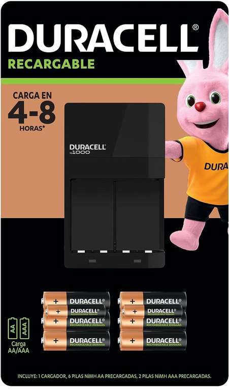 Cargador premium pilas recargables, carga extra rápida compatible con baterías DURACELL AA y AAA NiMH, incluye 1 cargador + 6 pilas AA recargables + 2 pilas AAA recargables (pre-cargadas)