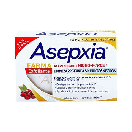 Amazon Ir a la ofertaJabón en barra Asepxia con efecto exfoliante, fórmula hidro-force con ácido salicílico y glicólico, combinado con extractos de ingredientes naturales.