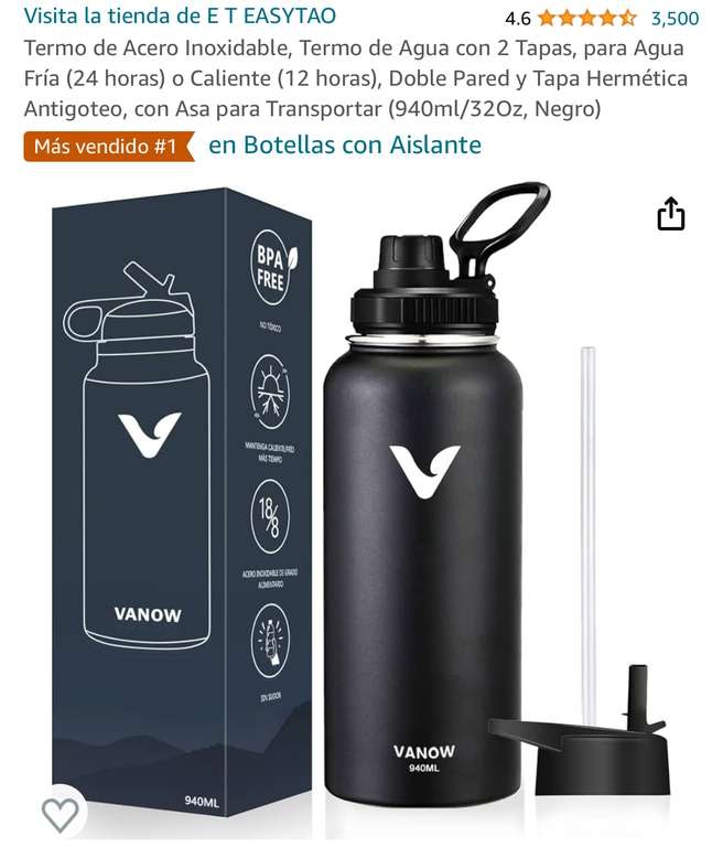 Amazon Ir a la ofertaAislamiento al vacío】El termo VANOW mantiene las bebidas heladas durante 24 horas y calientes hasta 12 horas con doble pared y aislamiento al vacío. Esta botella de agua de acero inoxidable sin BPA no transfiere sabores, no suda y no se oxida.