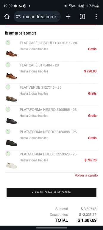 Andrea Ir a la ofertaAl estar navegando en la página de Andrea me di cuenta que al agregar 6 pares de la sección de últimos descuentos hasta 70% en el carrito solo se hacia el cobro de 2 pares (les sube un poco el precio al precio con descuento original y te cobra los de mayor precio en el carrito). Intenté con un par de combinaciones, me parece que no agarra con todo, es cuestión de buscar. También aplica 2x1 en algunos pares. El envío me salió en $216. Espero les sirva