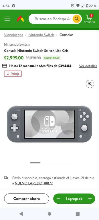 Bodega Aurrera Ir a la ofertaConsola Nintendo Switch Switch Lite Gris