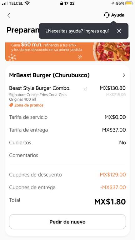 DiDi FoodBeast Style Burger Combo (hamburguesa, papas y bebida) tiene descuento del restaurante y queda en $130.80 y la aplicación agregó un cupón de $129.00