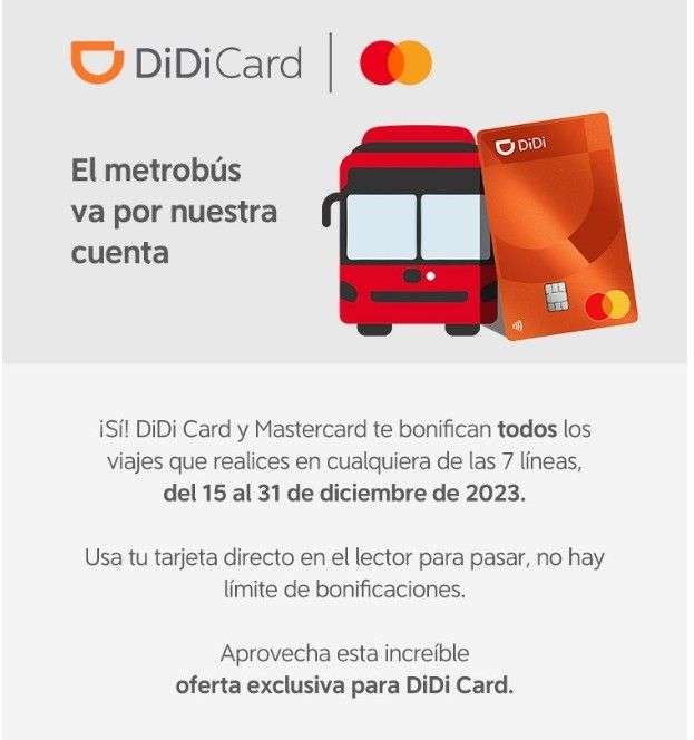 Así es apartir de hoy 15 al 31 de Dic 2023 Didi y Mastercard invitan todos los viajes q realices en metrobus pagando con tu DIDICARD y lo mejor q no hay límite de bonificacion