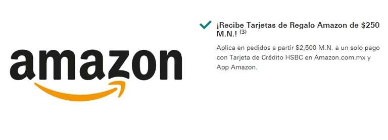 HSBC Ir a la oferta>Amazon.com.mx y en App Amazon a una sola exhibición en productos vendidos y distribuidos por Amazon México, productos vendidos por Amazon EE.UU. y productos vendidos por vendedores externos con Tarjetas de Crédito HSBC recibirás una Tarjeta de Regalo Amazon con valor de $250.00 M.N. Sólo se entregarán tarjetas de regalo por cada $2,500.00 M.N (dos mil quinientos pesos M.N) de pedidos; limitado a 4 Tarjetas de regalo por cliente. Pedidos a partir de $2,500.00 M.N. y hasta $4,999.99 M.N.: 1 tarjeta de regalo, pedidos a partir de $5,000.00 M.N. y hasta $7,499.00 M.N: 2 tarjetas de regalo, pedidos a partir de $7,500.00 M.N. y hasta $9,999.99 M.N.: 3 tarjetas de regalo, pedidos a partir de $10,000.00 M.N.: 4 tarjetas de regalo. No se entregarán tarjetas de regalo por importes parciales de pedidos. Monto máximo de Tarjetas de Regalo Amazon por cliente HSBC será de -,000.00 M.N. (equivalente a 4 tarjetas de regalo de $250.00 M.N. cada una). El cliente podrá validar que los productos y vendedores seleccionados sean participantes, en la página anterior de la confirmación de pago. Las Tarjetas de Regalo Amazon serán enviadas al correo electrónico registrado en la promoción a más tardar el 31 de diciembre de 2023 y tendrán una vigencia de 6 meses a partir de su fecha de activación. La Tarjeta de Crédito HSBC deberá estar al corriente de sus pagos y sin bloqueos. No aplica en compras a Meses sin Intereses, pedidos cuyo importe sea diferente al indicado en la promoción (múltiplos de $2,500.00 M.N. en compras en una sola exhibición), pedidos realizados por vendedores y distribuidos diferentes a los mencionados anteriormente (Distribuidos por Amazon México, productos vendidos por Amazon EE.UU. y productos vendidos por vendedores externos). No participan compras que presenten reverso o devolución a la Tarjeta de Crédito HSBC, compras reclamadas u objeto de alguna aclaración ante la institución.